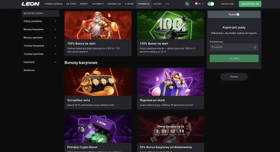 To część, która szczególnie interesuje graczy, dlatego przyjrzeliśmy się jej dokładniej, analizując bonusy kasynowe w LEON Polska. Sprawdziliśmy ofertę – jest w czym wybierać. LEON nie opiera się na jednej promocji, lecz oferuje zestaw ofert działających równolegle. Użytkownicy mogą liczyć na promocje na każdym etapie rozgrywki – bonus powitalny, darmowe spiny dla aktywnych, cashback czy turnieje. W casino online bonus bez depozytu nie należy do częstych okazji, ale może pojawić się w ramach sezonowych akcji lub promocji VIP.