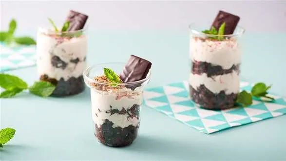 Kruszymy ciastka i wysypujemy nimi dna słoiczków. Za pomocą rękawa cukierniczego nakładamy warstwę musu miętowego. Ponownie dodajemy ciastka i nakrywamy je kolejną warstwą musu. Ścieramy czekoladę i posypujemy nią desery. Wstawiamy do lodówki na 30 minut.