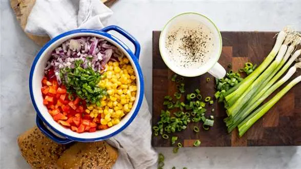 Czerwoną cebulę oraz paprykę kroimy w drobną kosteczkę. Kukurydzę odcedzamy na sicie. Dymkę drobno siekamy. Wszystkie składniki mieszamy w dużej misce.