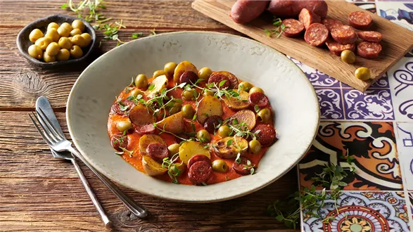 Sałatka na ciepło, która zawróci w głowie każdemu, kto uwielbia kuchnię w stylu hiszpańskim. To pyszne połączenie sosu z czerwonych warzyw, smażonych ziemniaczków, aromatycznego chorizo i oliwek. Przekonaj się, jak smakuje!
