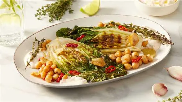 Smażona minisałata rzymska z dodatkiem aromatycznego sosu na bazie jogurtu greckiego i prażonej, lekko ostrej ciecierzycy. Wypróbuj ten pyszny przepis na szybki wegetariański obiad!