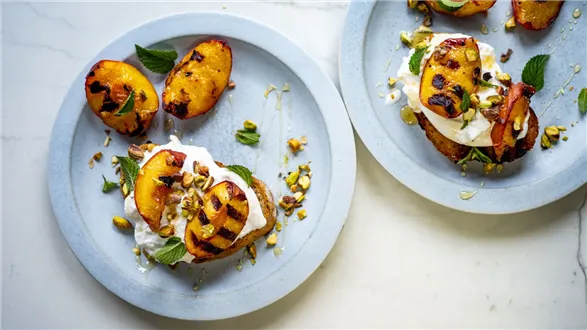 Na upieczone kromki chleba nakładamy po połowie sera burrata, na niego karmelizowane brzoskwinie. Całość posypujemy posiekanymi pistacjami, skrapiamy miodem i podajemy.