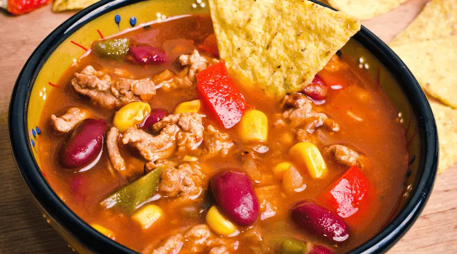 Kiedy mięso jest już dobrze podsmażone, dodaj pokrojone pomidory, kukurydzę oraz fasolę. Zalej wszystko bulionem, a następnie przypraw solą, pieprzem, papryką, oregano i kuminem rzymskim według własnego gustu. Gotuj zupę na małym ogniu przez około 30-40 minut, aż wszystkie składniki będą miękkie i dobrze się połączą. Na koniec, przed podaniem, spróbuj zupy i w razie potrzeby dodaj więcej przypraw, aby uzyskać idealny smak.